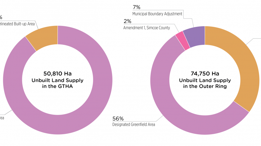 1. The Designated Greenfield Area: this land totals almost 103,200 hectares, fairly evenly split between the Inner Ring (Greater Toronto Hamilton Area) and the Outer Ring; about 87,440 hectares remains unbuilt.