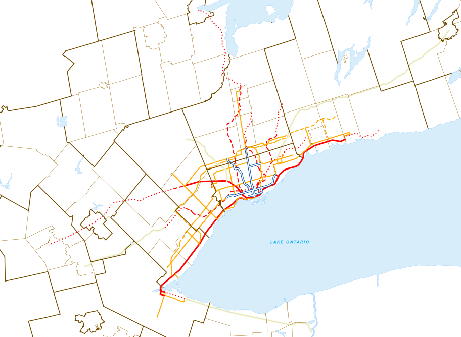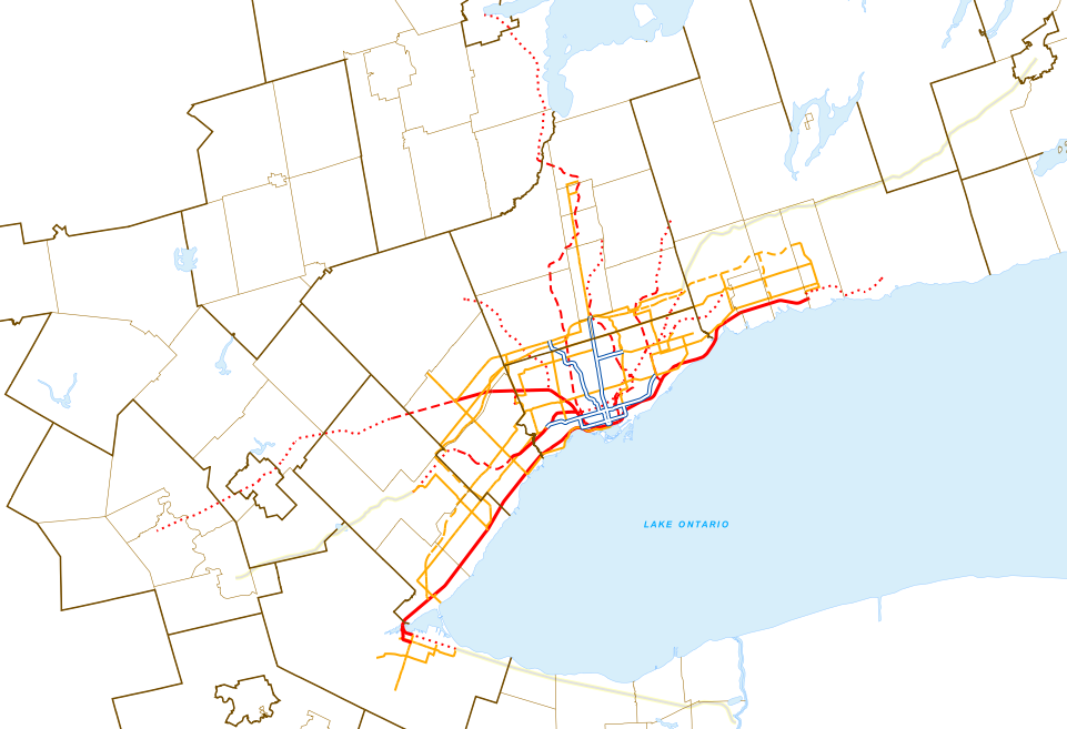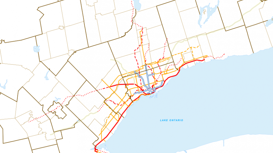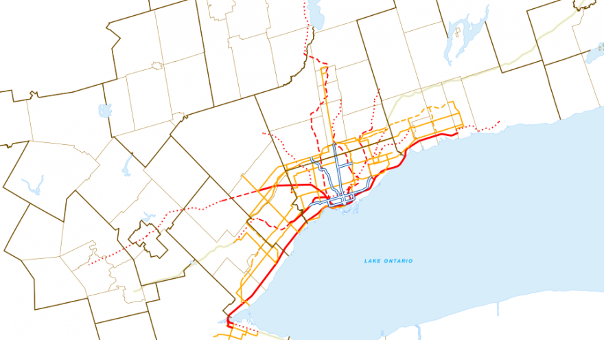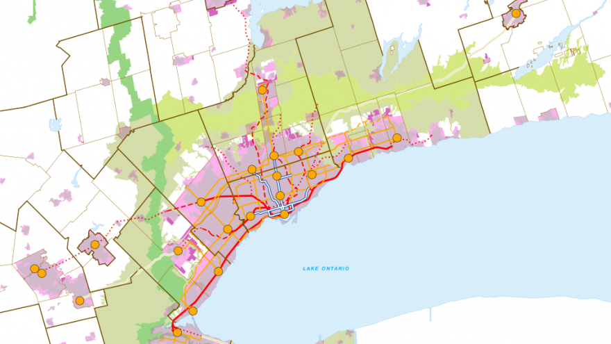 The lines represent possible regional rail extensions to Cambridge, Peterborough, and Niagara. These routes are currently under study.