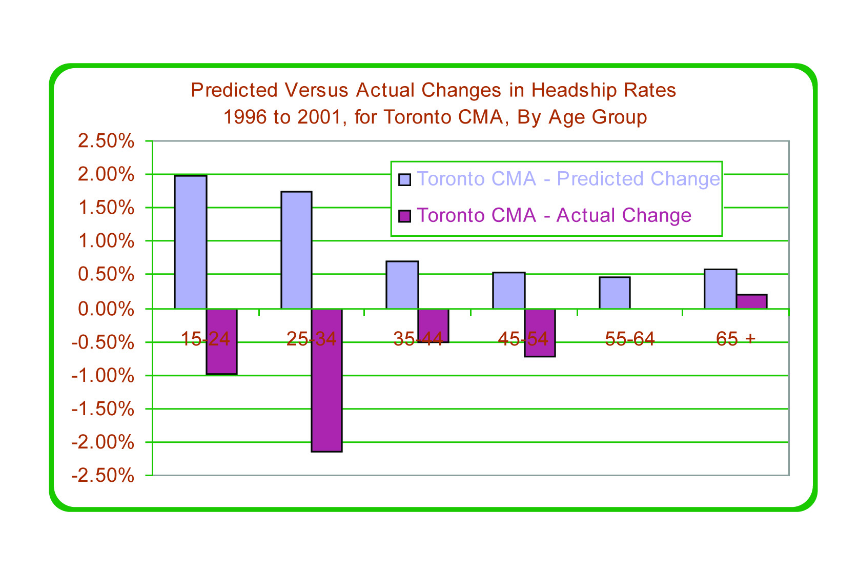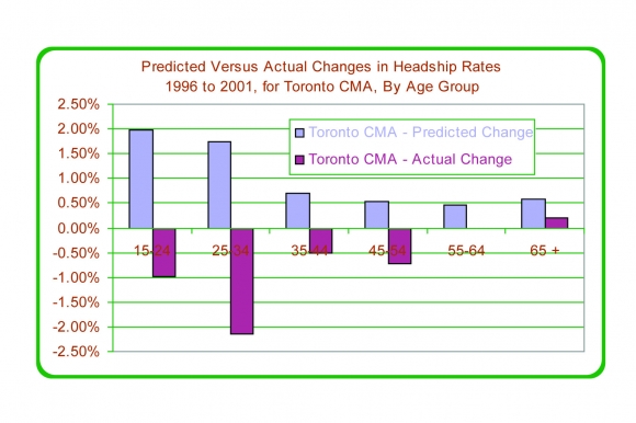 Figure 33: Predicted vs. Actual Changes in Headship Rates for Toronto CMA, by Age Group, 1996 to 2001