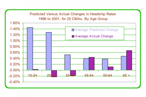 The results for the Toronto CMA are of particular interest. Figure 33 compares the predicted increases in headship rates with the actual increases, and shows that the Toronto CMA estimates were completely inaccurate: while increased headship rates are predicted for all age groups, the rates actually fell for five of the six age groups. The magnitudes of the errors were especially large for the two youngest age groups. The reduction in headship rates for the 15-24 and 25-34 age groups is undoubtedly related to the rapid rent increases that occurred after the introduction of the Tenant Protection Act in June 1998. Unfortunately, in the analysis of all 25 CMAs, rents were not found to significantly affect headship rates, as the effects of owners' costs were overwhelming statistically. Thus, it is not possible to test the extent to which rent increases might have reduced headship rates in Toronto.