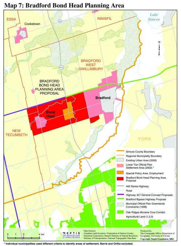 In February 2004, consultants for the developer produced a "Regional Context Overview" report.64 This report makes the case for the development of the Bradford Bond Head Planning Area on the grounds of existing and potential water and highway infrastructure capacity, compatibility with provincial and local policy, and the inability of the GTA to accommodate projected population growth. The Town of Bradford West Gwillimbury is reviewing the revised Official Plan Amendment application.