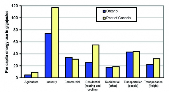 Figure 3 does not include the energy used to produce usable energy, either the energy used to produce electricity, as discussed above for Ontario, or the large amounts of energy used to produce oil from the tar sands noted at the beginning of this paper.10 The higher energy use for industry in the rest of Canada mostly reflects the energy-intensity nature of the pulp and paper industry, which in 2000 used 15.4 gigajoules per capita in Ontario and 41.1 gigajoules per capita in the rest of Canada. The other large difference--for residential heating and cooling--likely occurred because people in Ontario generally live in a milder climate than other Canadians.