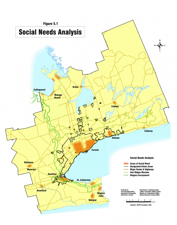Figure 5.1 highlights areas that show above average incidence of a range of socio-economic indicators - in other words, areas of particular social need. Directing new growth to these areas can contribute to the socio-economic regeneration of these areas, by improving the quality of the physical environment, or increasing the range of services or employment opportunities, for example. A Smart Growth strategy for the Central Ontario Zone may also include an explicit social component, which focuses more comprehensively on addressing socio-economic issues in these areas.