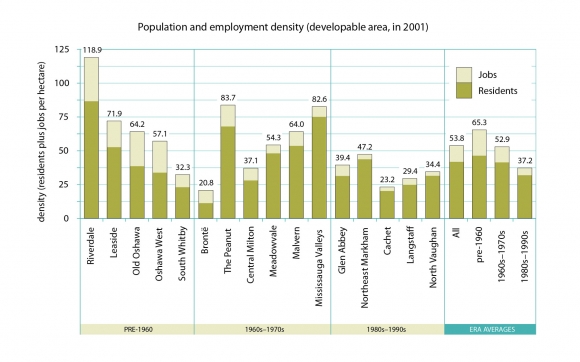A study of 16 largely residential, 400-hectare (2-km-square) areas in different parts of the GTA, representing different eras of development, showed that the more recent the development, the lower the population and employment density. The five areas built out in the 1980s and 1990s average 37 people plus jobs per hectare. Research shows that designated employment lands typically accommodate fewer than 40 jobs per hectare. To achieve an overall density of 50 people plus jobs per hectare, densities in both residential neighbourhoods and employment lands would have to increase.