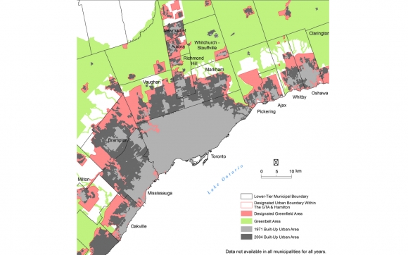 Over the past 50 years, the GTA has grown through contiguous addition to existing built-up urban areas. The map shows how the outward expansion of the Toronto-Mississauga urban area has expanded to incorporate formerly freestanding towns such as Brampton, Unionville in Markham, and Richmond Hill. The locations of designated future greenfield growth areas, shown in red, illustrate the continuation of the policy of contiguous outward expansion. As this area fills up in the coming decades, there will be pressure to open the band of unprotected countryside between the Greenbelt and the present designated greenfield area for development.