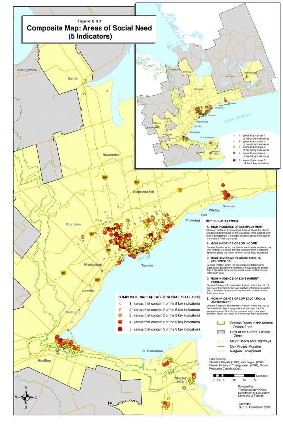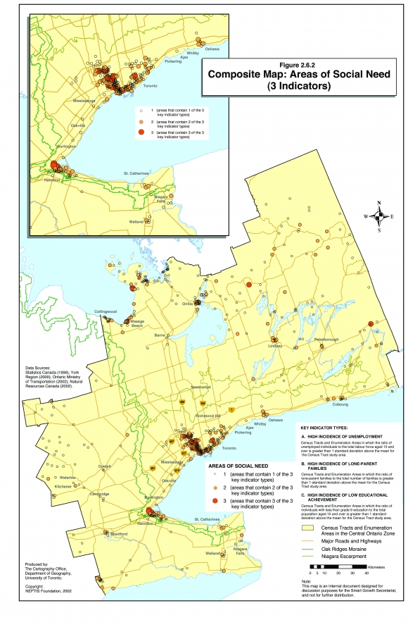 Within the urban areas of the Zone, both composite maps suggest the same pattern of social need. The areas of concern are primarily a U-shaped area within the City of Toronto, as well as the older parts of Hamilton and Oshawa, and smaller centres such as Kitchener/Waterloo, St. Catherines, Niagara Falls, Brantford and Orillia. Rural areas also show concentrations of social need, as indicated on Figure 2.6.1, including parts of Haliburton, Kawartha Lakes, the Georgian Bay shoreline, Waterloo and Wellington.