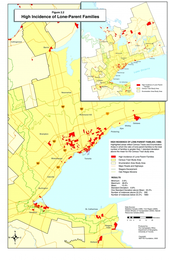 As shown on Figure 2.2, areas demonstrating a relatively high incidence of lone-parent families occur primarily in the Zone's urban areas. There are concentrations in the City of Toronto, particularly in the east, west, and south areas of the City. Other areas demonstrating relative concentrations include Hamilton, St. Catherines, Niagara Falls and Oshawa. Some sporadic cases also occur in the Zone's rural areas, such as Haliburton, Kawartha Lakes and Simcoe County.