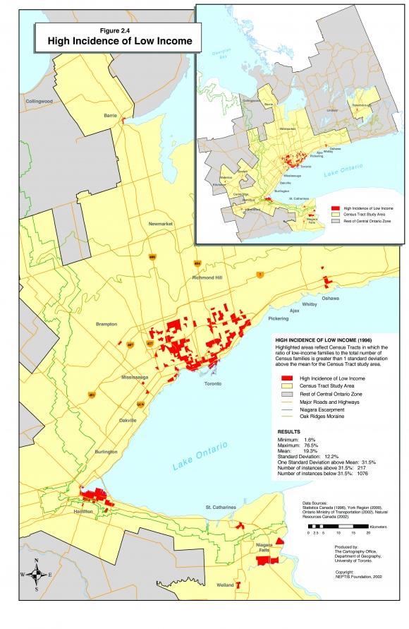 Figure 2.4 shows areas with high incidence of low income, based on Statistics Canada's Low Income Cut Off (LICO). Like the previous indicators, low-income areas tend to be found in the older urban centres, such as Toronto, Hamilton, Oshawa and Niagara.