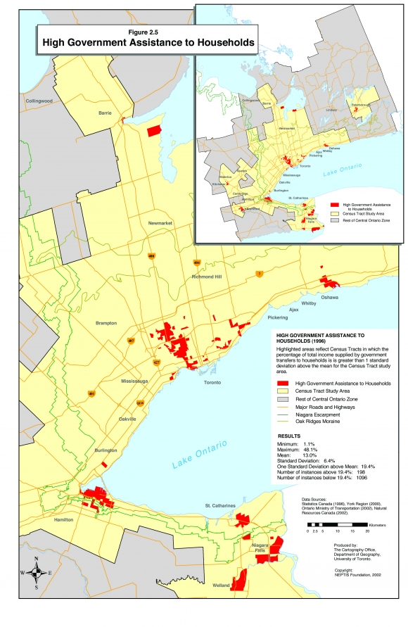 Again, areas in the more mature urban centres are especially dependent on government transfers. As with the measure of educational attainment, however, Scarborough does not appear, as it does for some of the other social indicators.