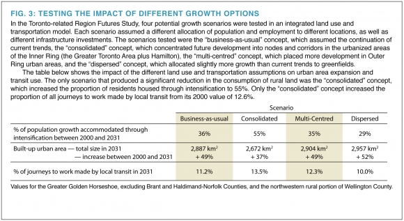 The potential impact of achieving a 40% rate of intensification on transit use and other behaviours is unknown. However, the Toronto-related Region Futures Study, undertaken for Neptis and the Province of Ontario's Smart Growth Secretariat by the IBI Group in 2003, modelled future transit use and rural land consumption under four different scenarios. This research showed that even if policies were enacted that directed a considerably higher proportion of population growth to existing urban areas, transit's share of transportation demand would rise and rural land consumption would fall by only small amounts relative to "business-as-usual." [See Fig. 3.] The simulation indicated that modest increases in intensification are likely to achieve little.