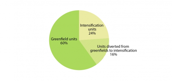 The green and beige wedges of the pie indicate units that would be in the form of intensification or on greenfields regardless of the Growth Plan. The hatched area indicates the proportion of units likely to be diverted from greenfields to intensification as a result of the Growth Plan.