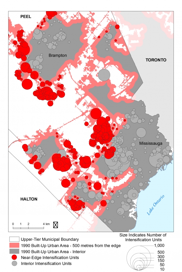 About 50% of so-called residential intensification that occurred between 1991 and 2001 in the Greater Golden Horseshoe was within 500 metres of the edge of the built-up urban area. The map shows the built-up urban area as it was in 1990 for south Peel Region. Land within 500 metres of the outside edge of the urban area is shown in light red; the interior urban area is shown in grey. The circles indicate the approximate location and magnitude of residential intensification in both the near-edge and interior areas. While filling in holes near the edge of the urban area is a good and likely inevitable part of the development process, it does not represent the kind of effective intensification required to further the goals of the Growth Plan, such as reduced automobile use and more efficient provision and use of infrastructure.