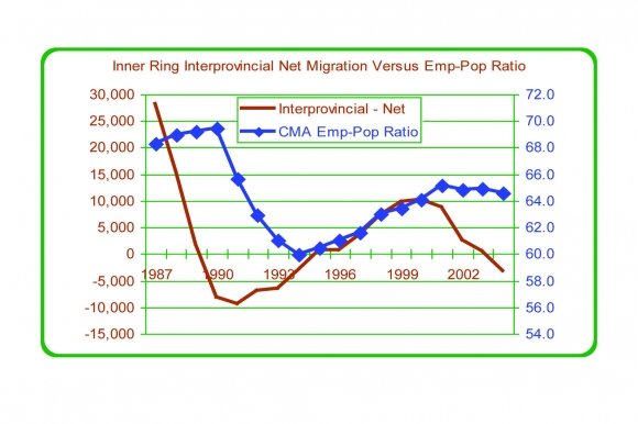 Figure 15: Inner Ring Interprovincial Net Migration vs. Employment-to-Population Ratio, 1987 to 2004