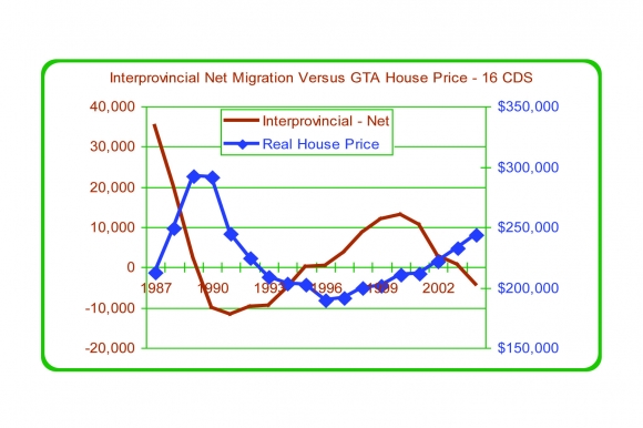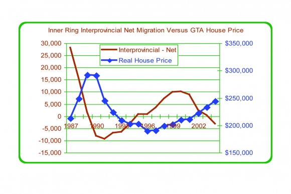 Figure 16: Inner Ring Interprovincial Net Migration vs. GTA House Prices, 1987 to 2004