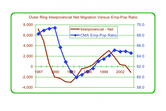 Figure 17: Outer Ring Interprovincial Net Migration vs. Employment-to-Population Ratio, 1987 to 2004