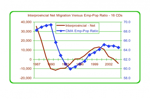 At the end of the 1980s, a plummeting employment ratio was mirrored by plummeting net interprovincial migration. Indeed, between 1990 and 1994, more people left the area than arrived. The economic recovery during the second half of the 1990s improved net interprovincial migration. Since 2000, it has dropped again, and in 2004, more people left than arrived.