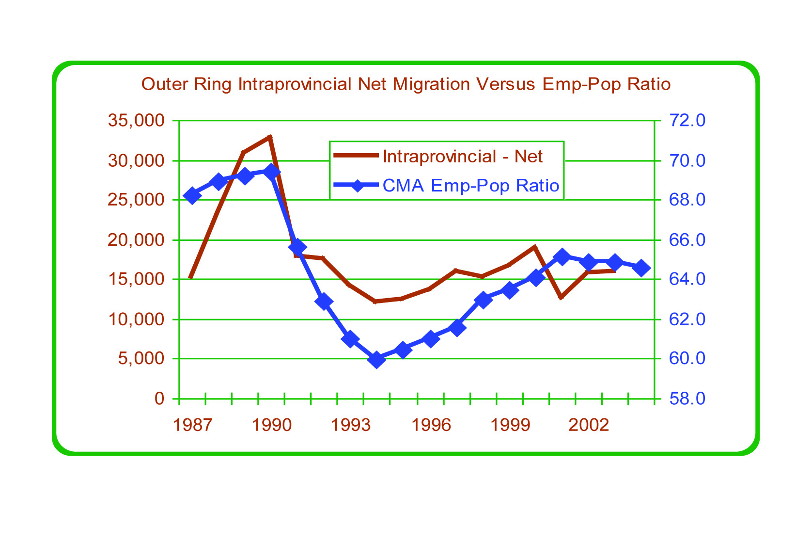 Figure 23: Outer Ring Intraprovincial Net Migration vs. Employment-to-Population Ratio, 1987 to 2004