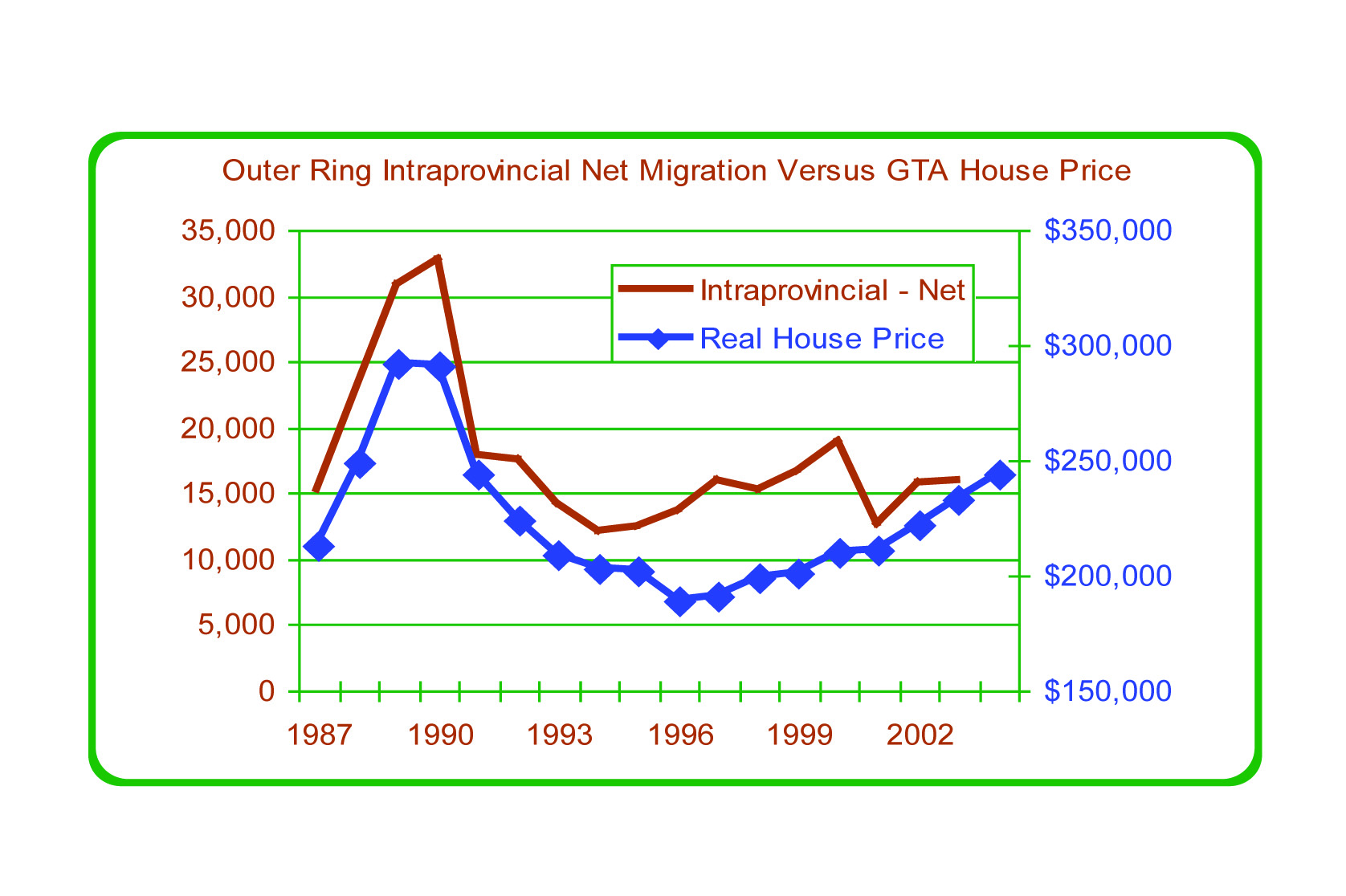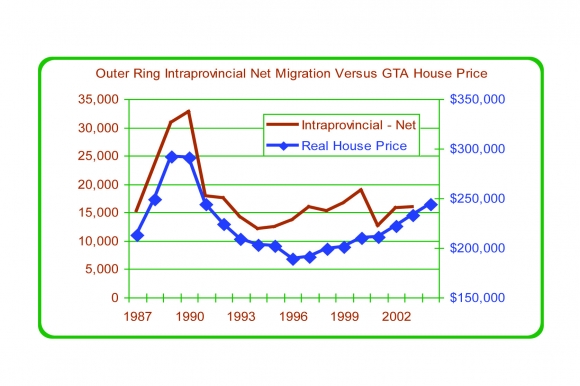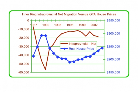 Figure 22: Inner Ring Intraprovincial Net Migration vs. GTA House Prices, 1987 to 2004