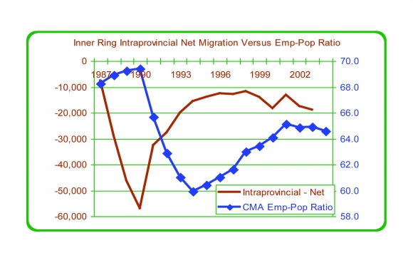 Figure 21: Inner Ring Intraprovincial Net Migration vs. Employment-to-Population Ratio, 1987 to 2004
