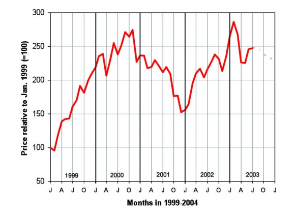 How crude oil prices have changed since January 1999 is shown in Figure 8, with anticipated changes until January 2004.26 The overall change in price has been similar to that for wholesale natural gas, but with less fluctuation. Crude oil prices are not reflected so strongly in retail gasoline and diesel fuel prices because of the high tax component (in Ontario in mid-2003, federal and provincial taxes on road fuel each comprised just over 20% of retail prices).