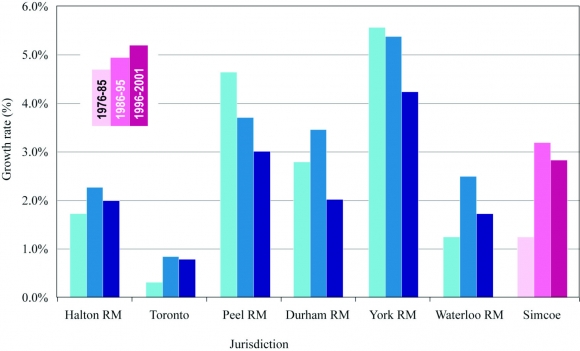 The population of the Toronto-related region grew from 4.8 million people to 7.3 million between 1976 and 2001, an increase of 52%. While the GTA plus Simcoe County (GTA+S) accepted an average of 50,000 people a year between 1976 and 1981, it accepted more than 100,000 a year between 1996 and 2001.