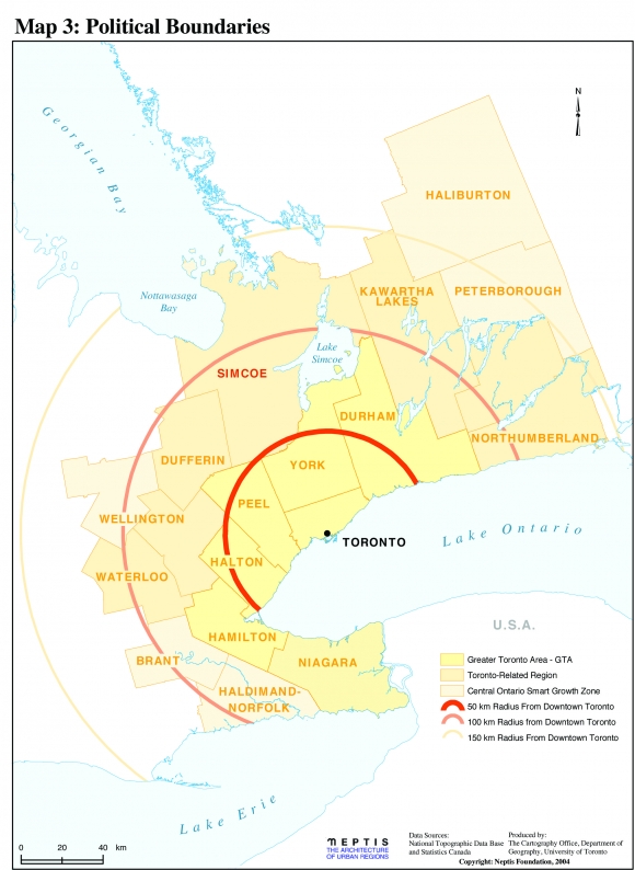 The Neptis Foundation's Toronto-Related Region Futures Study defined "Toronto-related region," which includes the Greater Toronto Area, the City of Hamilton, the Regional Municipalities of Waterloo and Niagara, parts of Wellington and Peterborough Counties, Dufferin, Simcoe and Northumberland Counties, and the City of Kawartha Lakes. This definition will be used in this report (see Map 3).