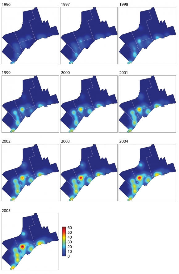 Table 3 indicates the widespread development of power centres in the GTA. As Figure 9 shows, this growth in power retail capacity has not occurred evenly over space. Early inner-suburban expansion of capacity in Toronto has yielded to the intensification of power retailing in the suburban GTA, and infill development in the inner urban area. This trend clearly contrasts with the concentration of shopping centre and traditional retailing primarily within the historic urban core and the inner suburbs. The largest concentration of power retailing in the region has been built around the junction at the intersection of Highway 400 and Highway 7, to the north of the City of Toronto. This sort of development indicates the importance of accessibility by automobile associated with "remote" parcels located near infrastructure constructed during Canada's era of highway expansion (1950s and 1960s). Land owners and developers make the most of this accessibility advantage (i.e., the ability to reach markets and attract consumers who drive cars) provided by public infrastructure, drawing consumers from both newly developed suburban and exurban residential areas, and from elsewhere across the region.