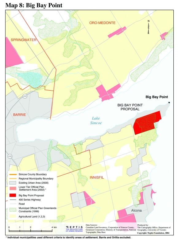 The proposed Big Bay Point Resort is on the shores of Lake Simcoe in Innisfil. Geranium Corporation, which is working with Florida-based Duany Plater-Zyberk & Company, describes the proposal as a "world-class adult-lifestyle resort."66 The development would have between 3,200 and 3,500 residential units, an 18-hole golf course, three theatres, and a Venice-inspired marina. At full build-out, the 234-hectare development will house approximately 7,500 residents67 (see Map 8). Geranium Corporation has previously developed similar projects in Niagara Region. The rationale for the Big Bay Point Resort is contained in 18 technical and needs assessment reports that analyse market needs and review alternative sites.